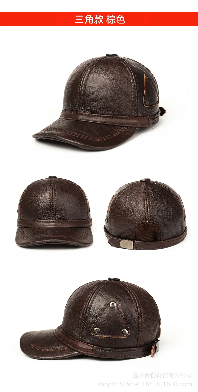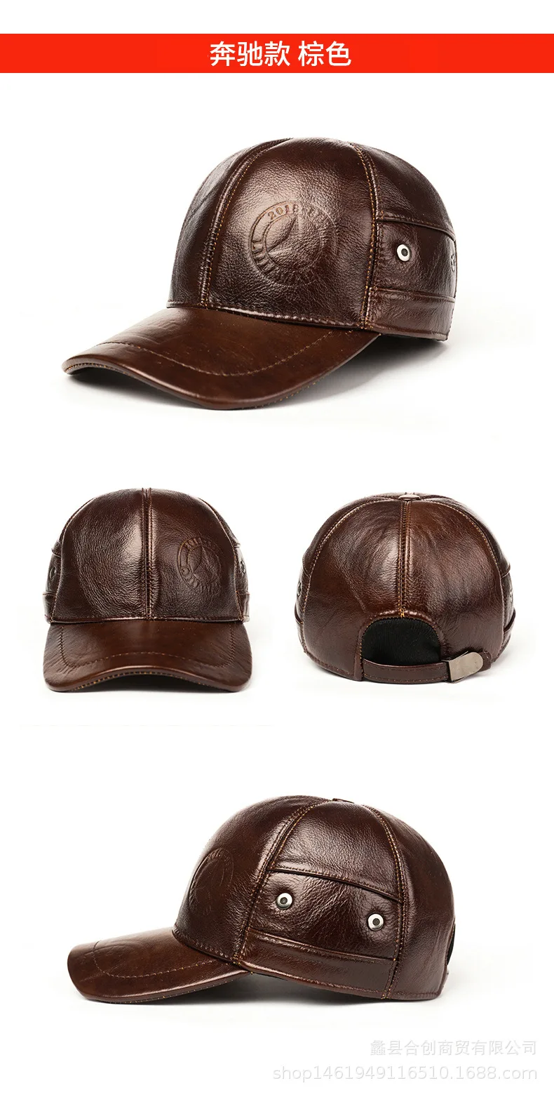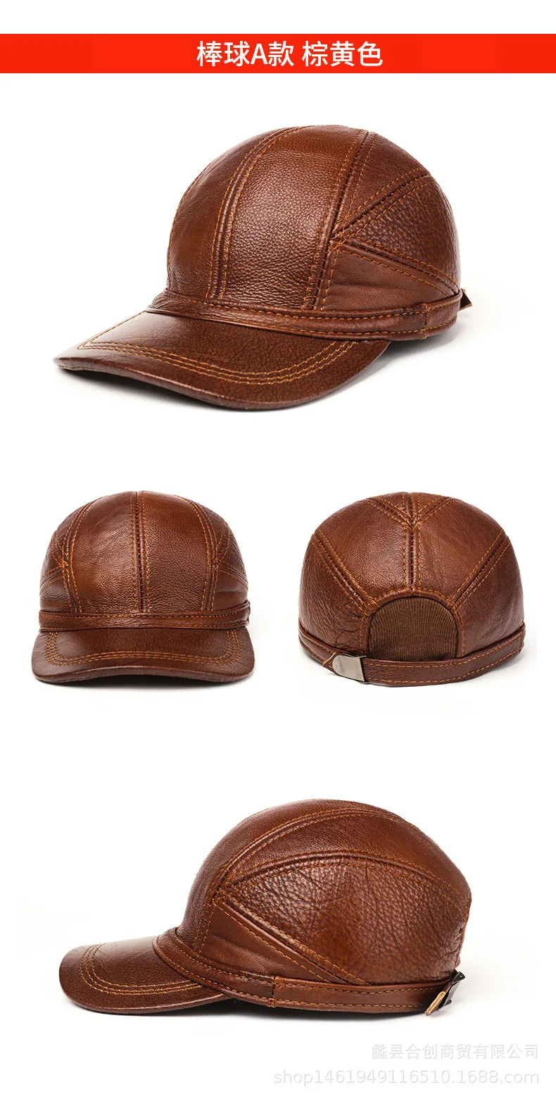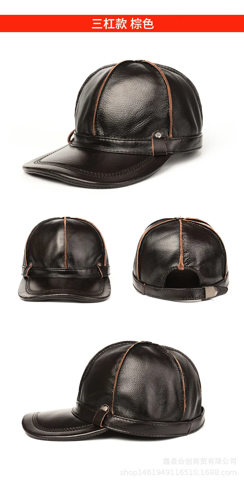 Mens Leather Cap Winter Warm Real Cowhide Baseball Hat With Ear Flaps For Outdoor Mature Men