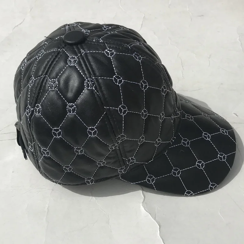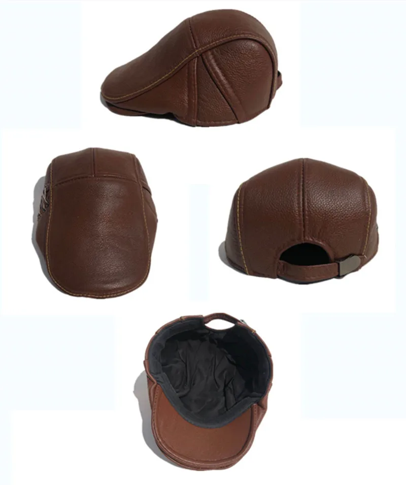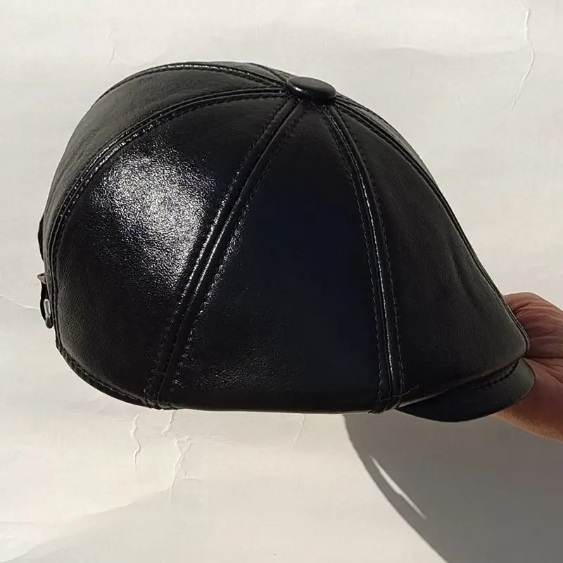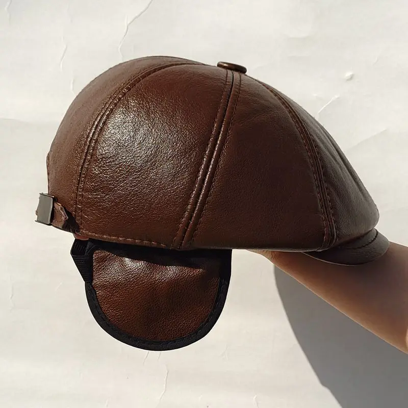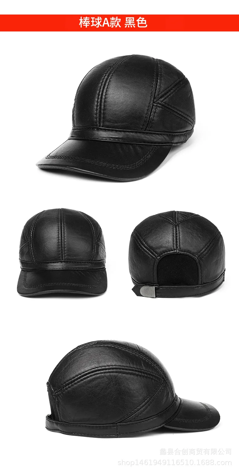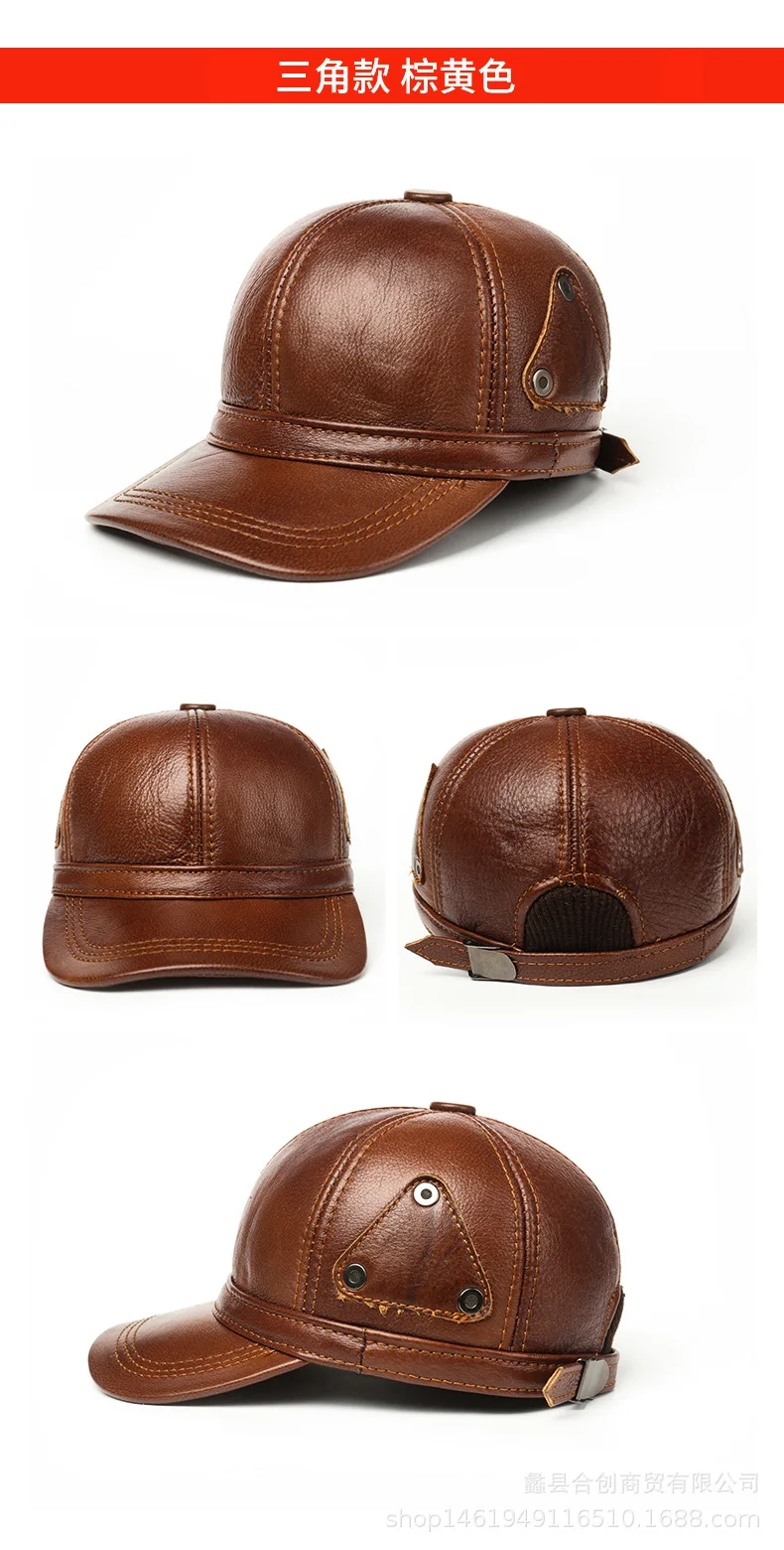 Mens Leather Cap Winter Warm Real Cowhide Baseball Hat With Ear Flaps For Outdoor Mature Men