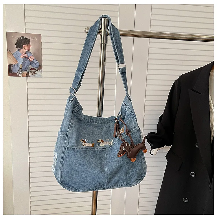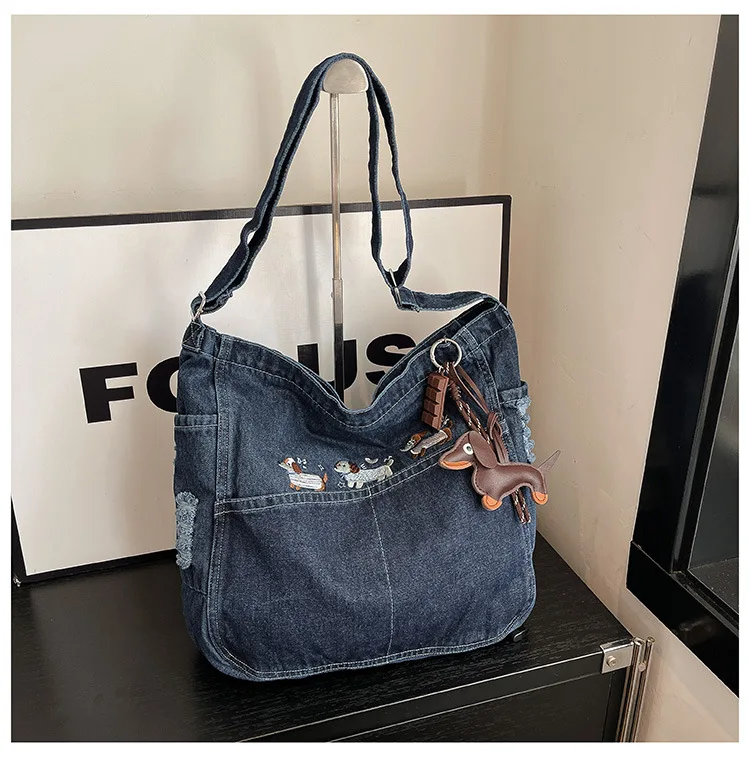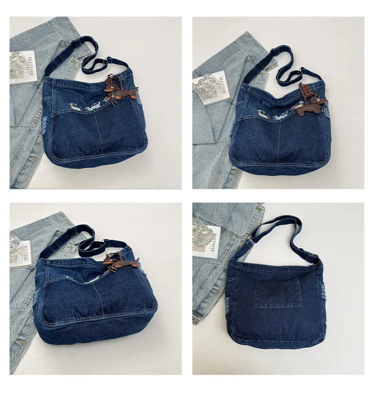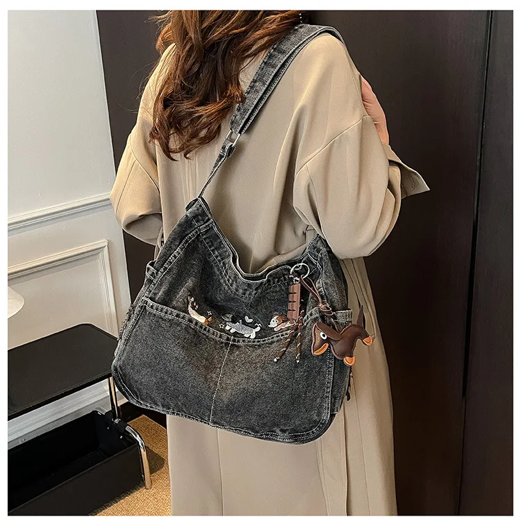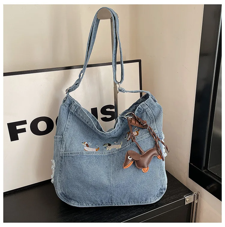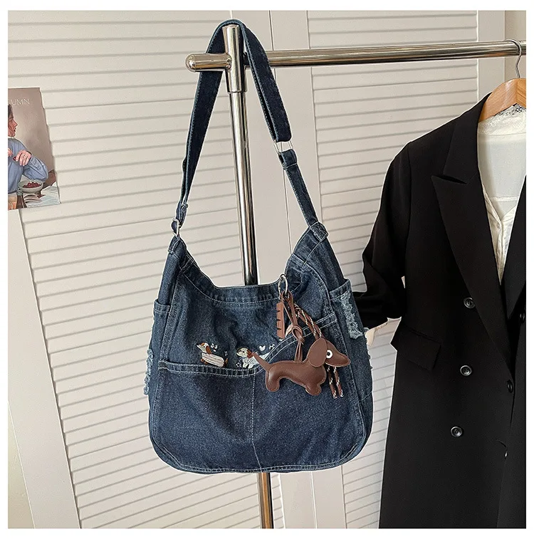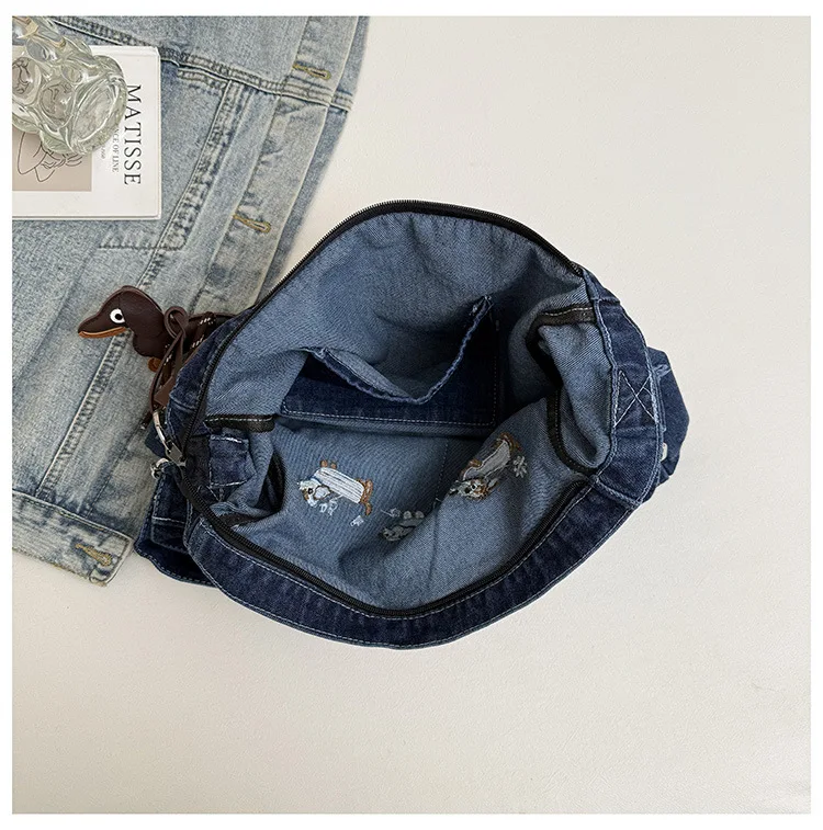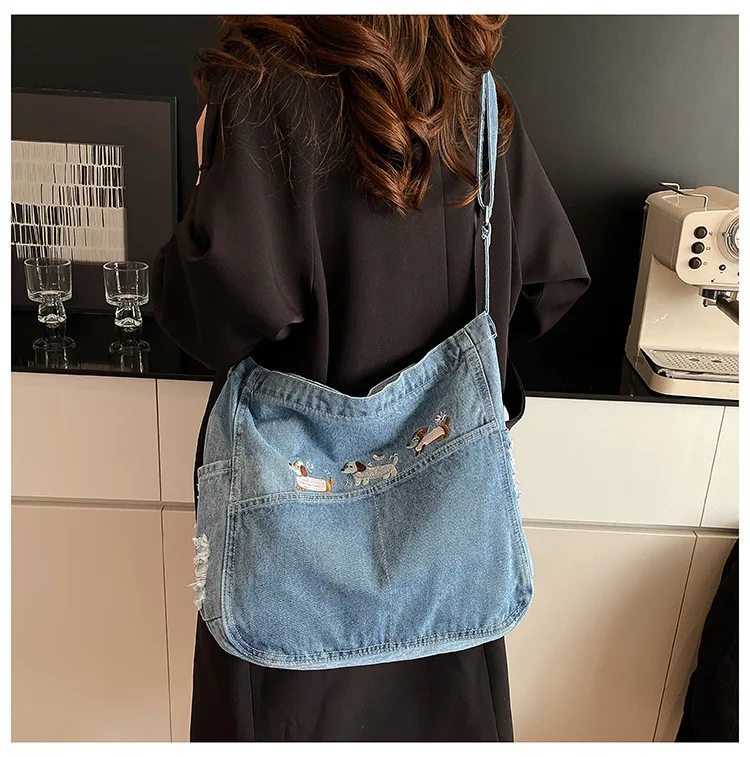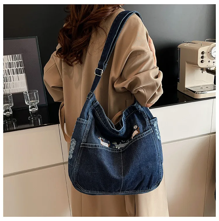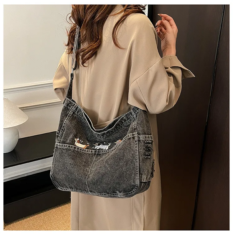 New Spring Women Crossbody Bag Fashion Embroidery Denim Shoulder Bag Casual Retro Pure Color Versatile Texture Commuting Bag