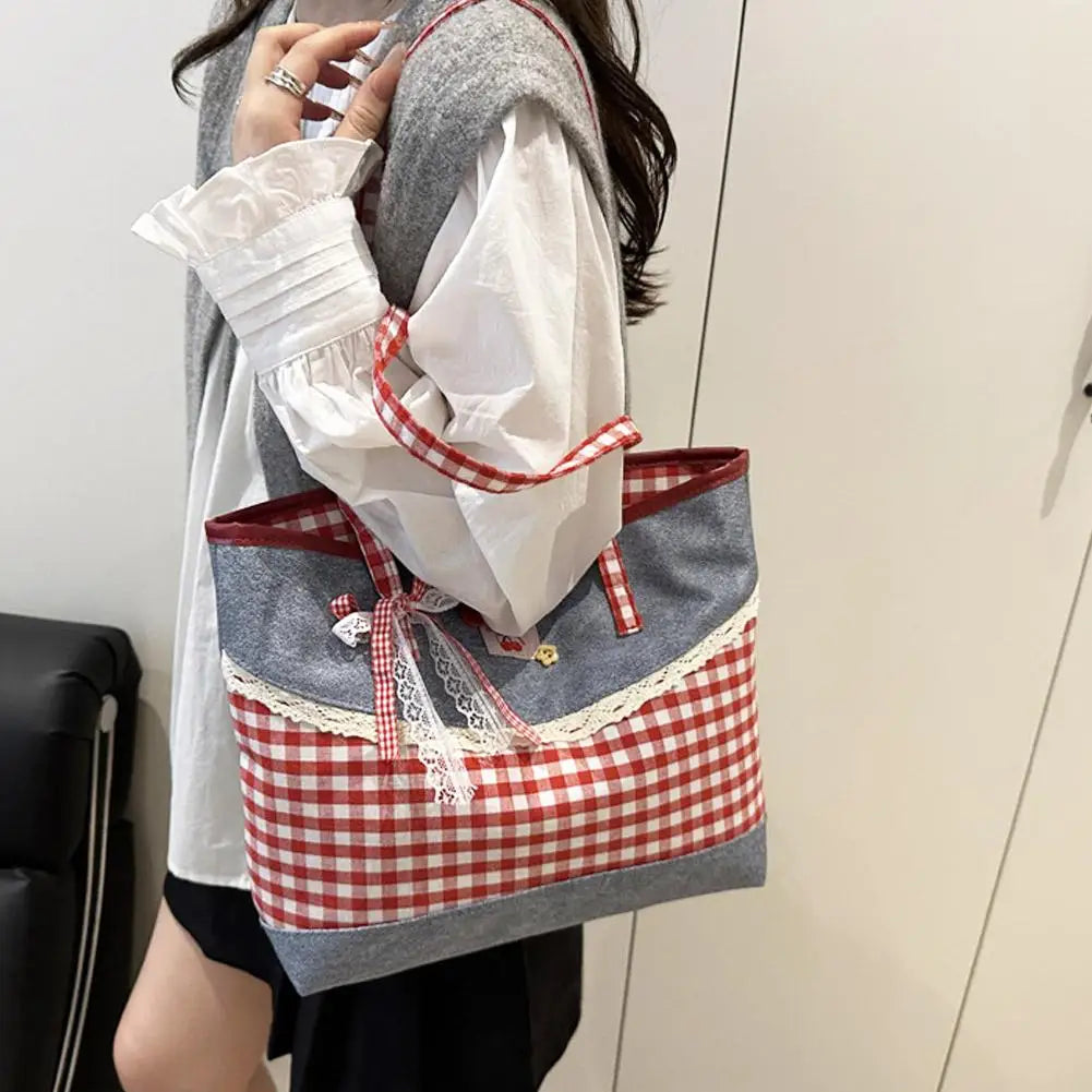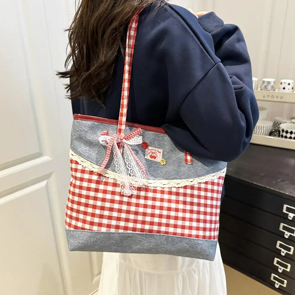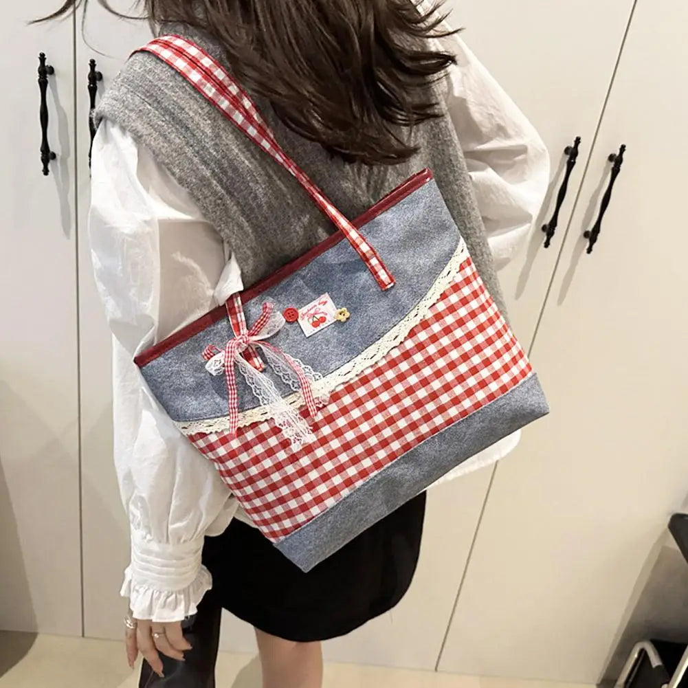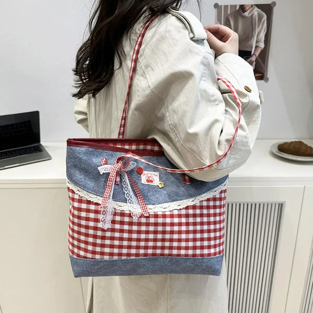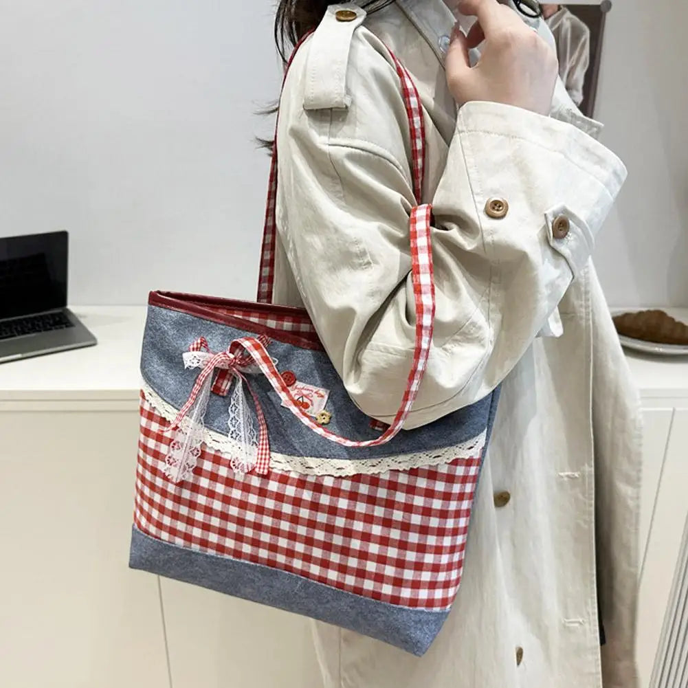 Retro Lattice Lace Bow Shoulder Bag Lovely Rural Style Denim Plaid Handbag Leisure Vintage Commuting Tote Bag Women
