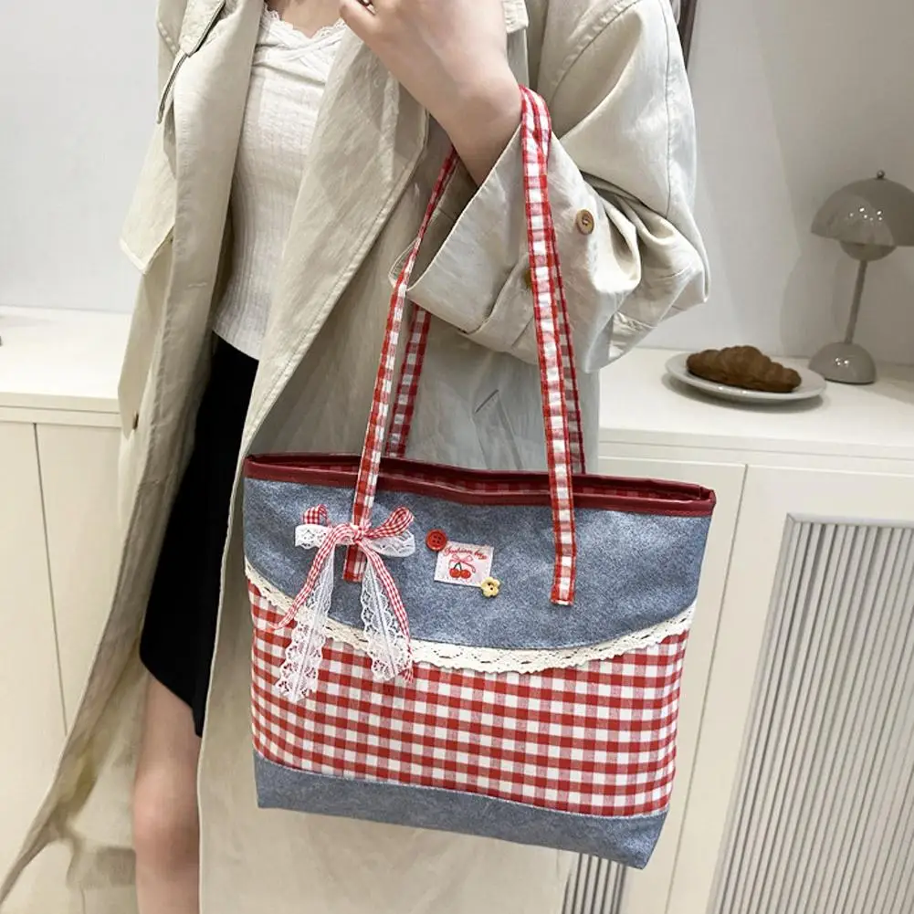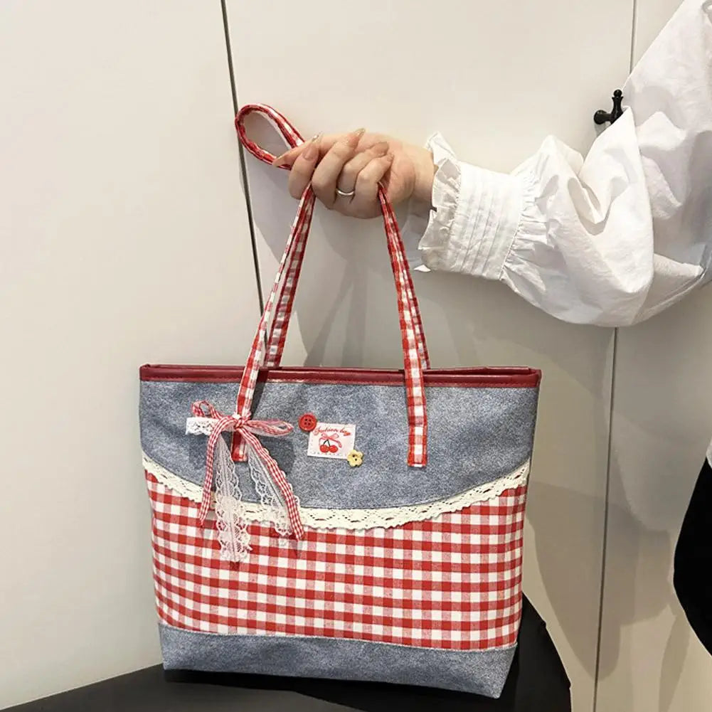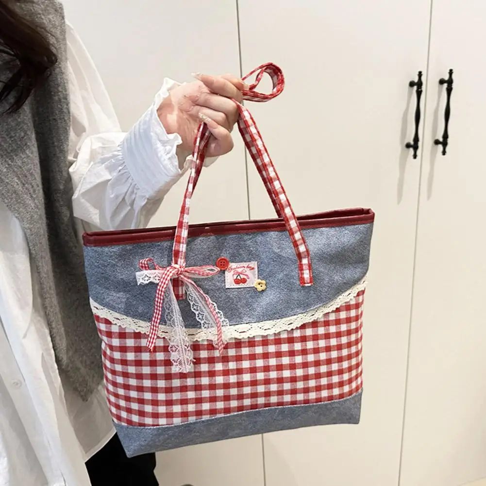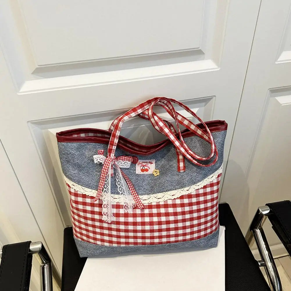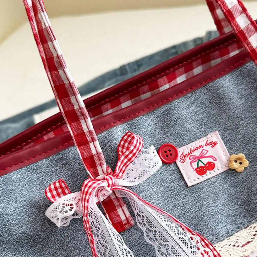 Retro Lattice Lace Bow Shoulder Bag Lovely Rural Style Denim Plaid Handbag Leisure Vintage Commuting Tote Bag Women