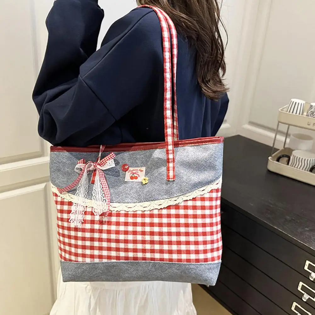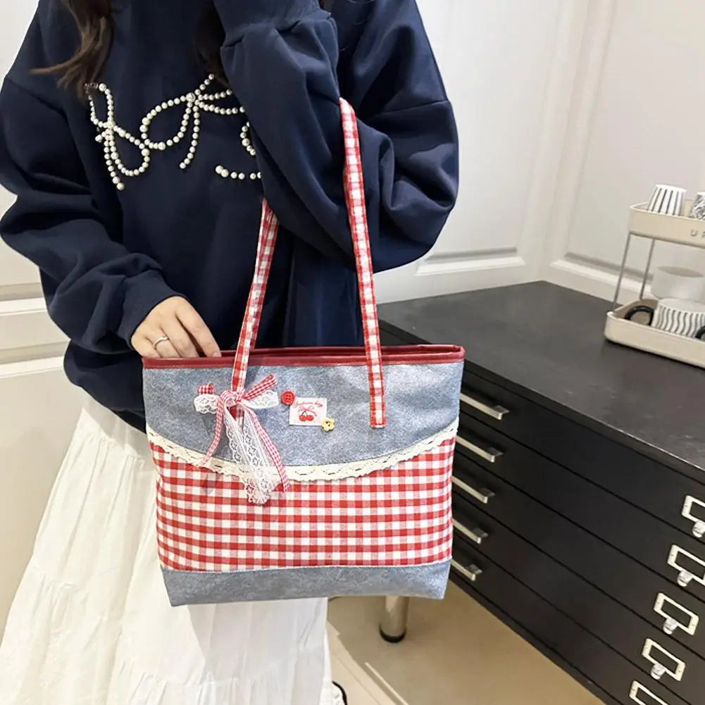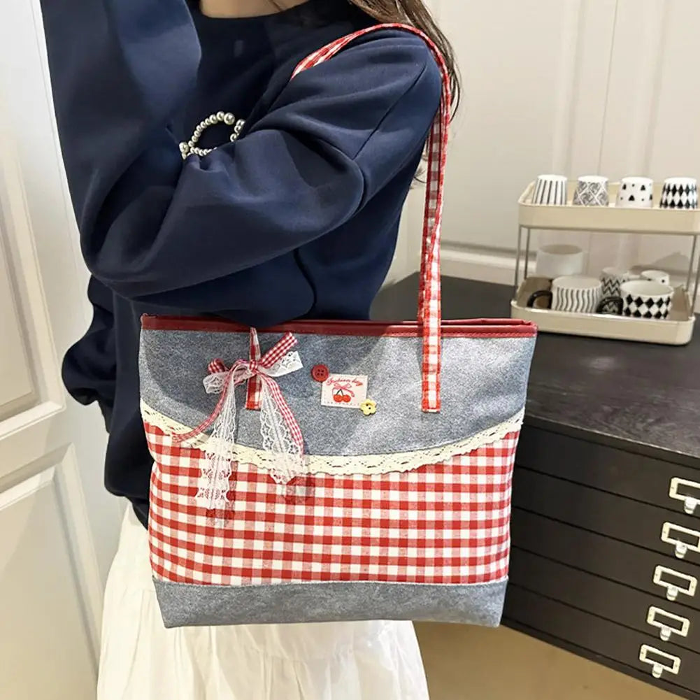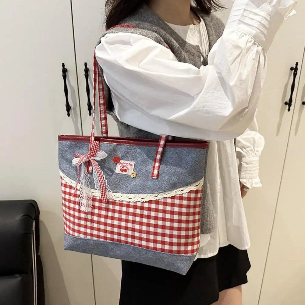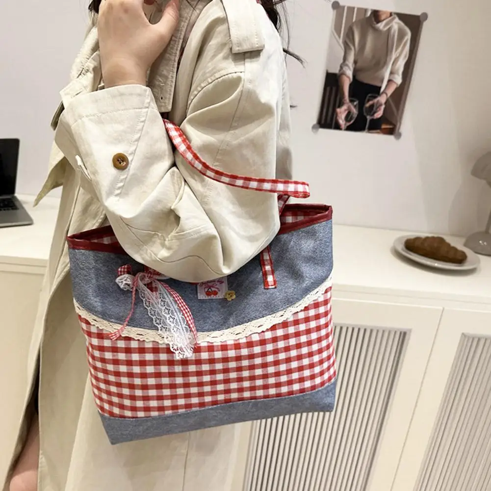 Retro Lattice Lace Bow Shoulder Bag Lovely Rural Style Denim Plaid Handbag Leisure Vintage Commuting Tote Bag Women
