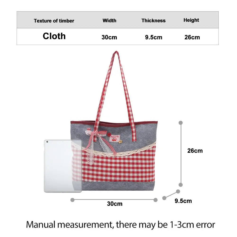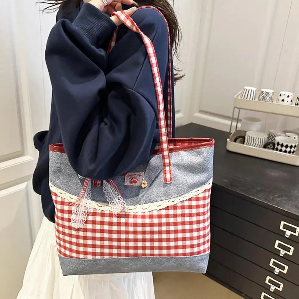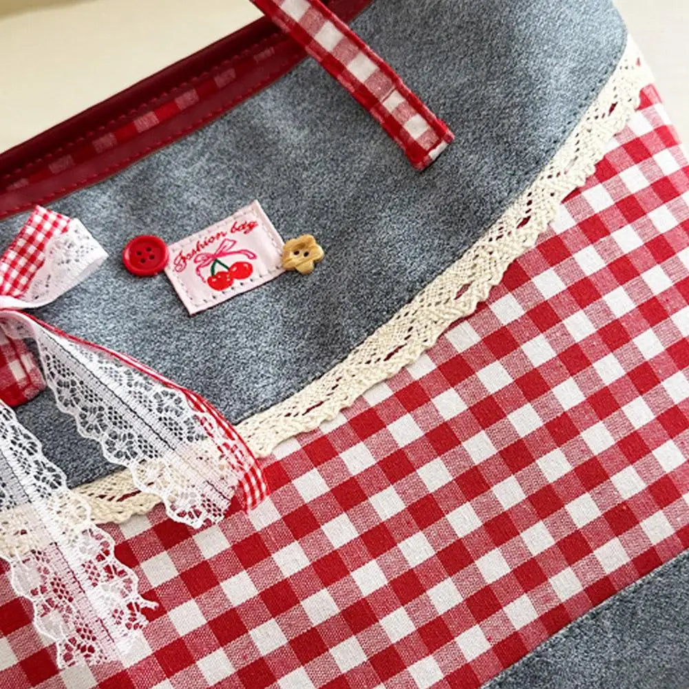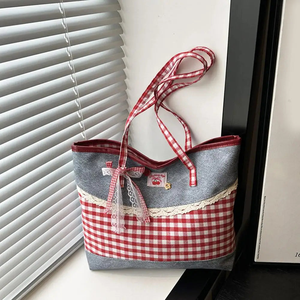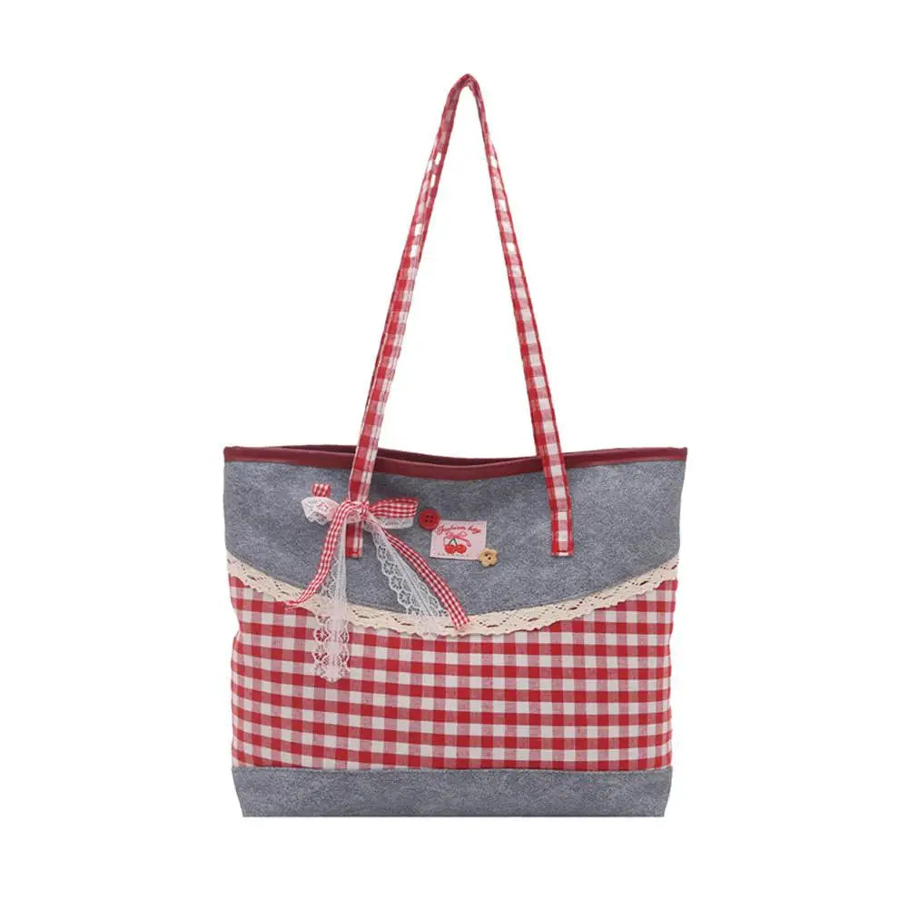Retro Lattice Lace Bow Shoulder Bag Lovely Rural Style Denim Plaid Handbag Leisure Vintage Commuting Tote Bag Women